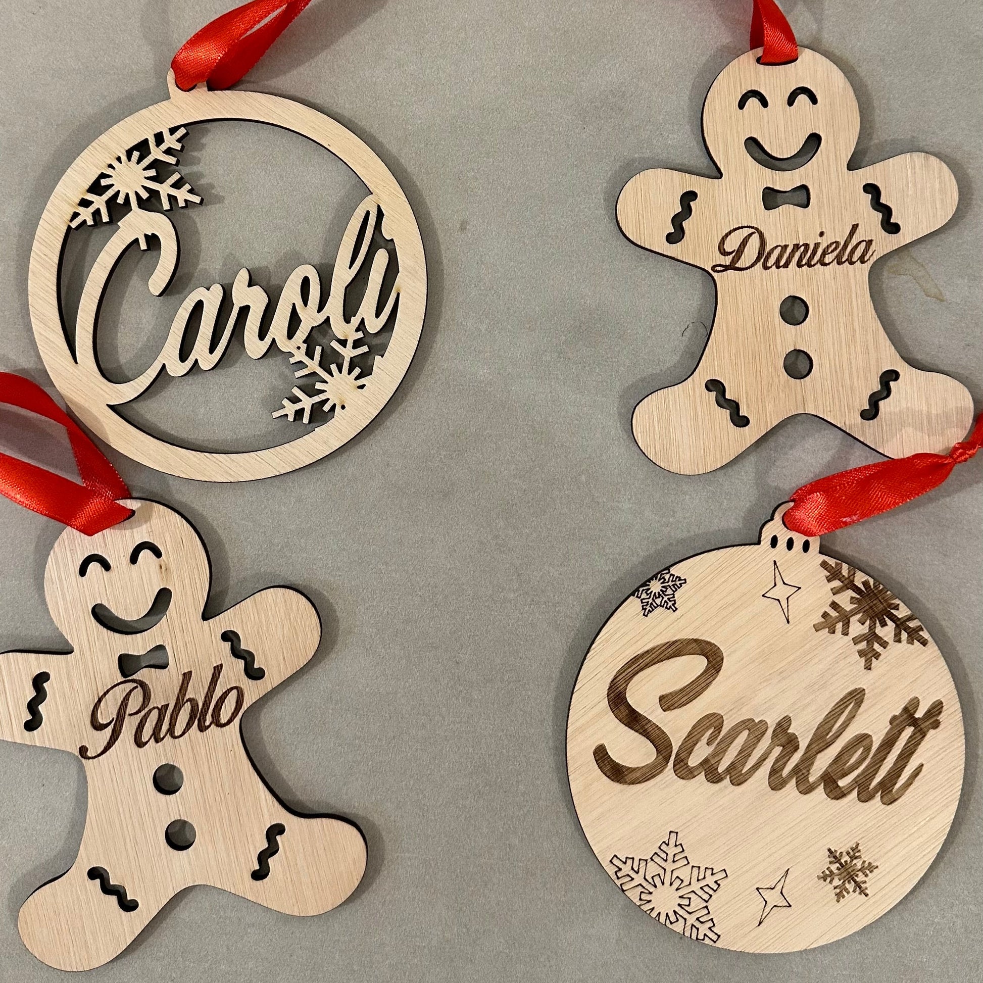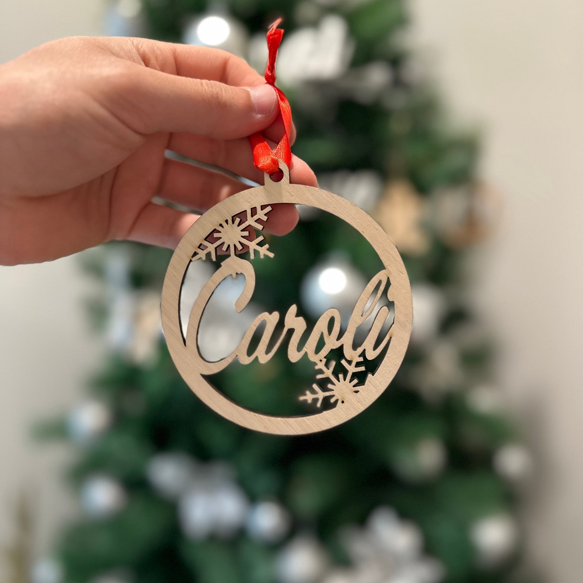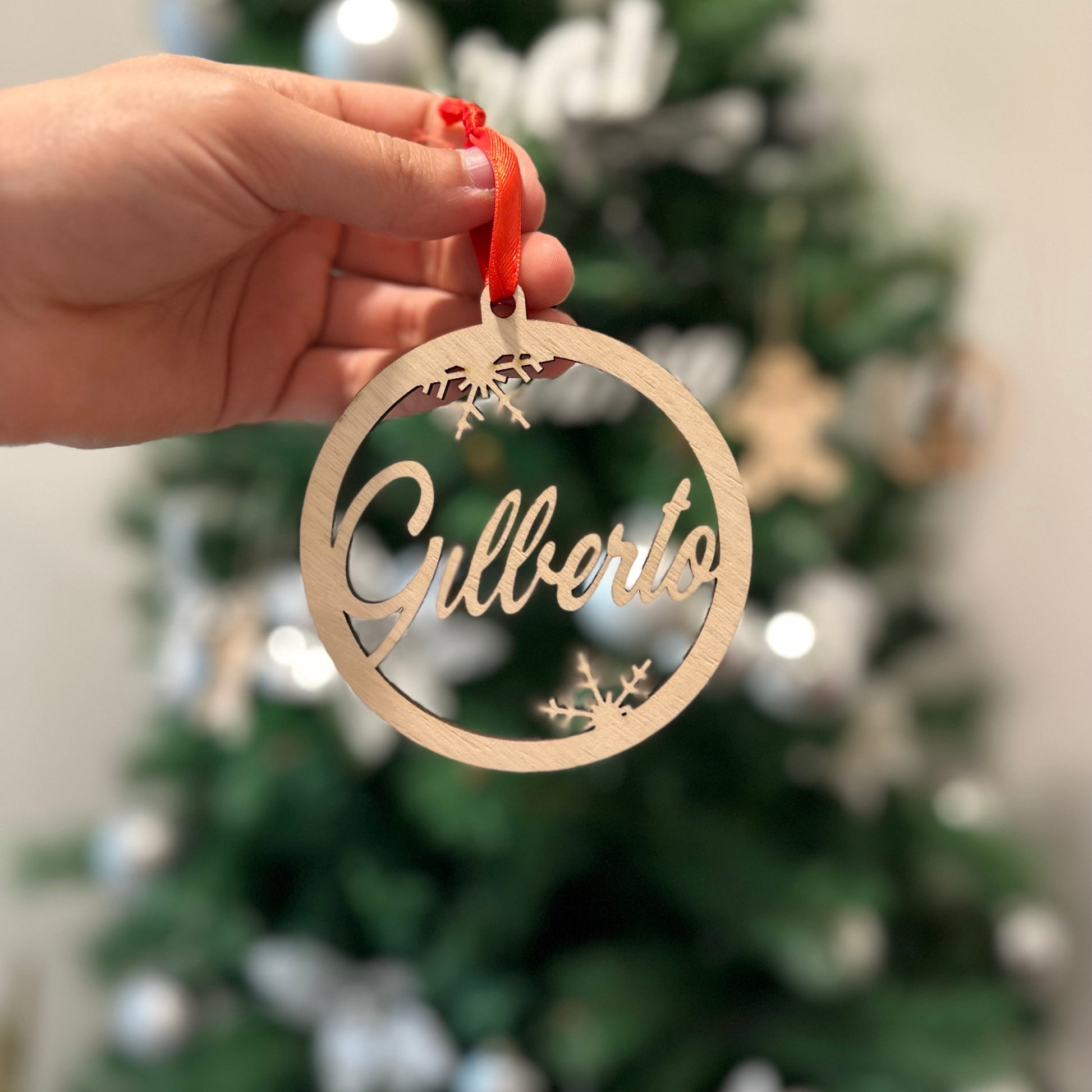 El nombre cortado se rodea de delicados diseños de copos, creando un adorno único que resalta entre las luces del árbol.